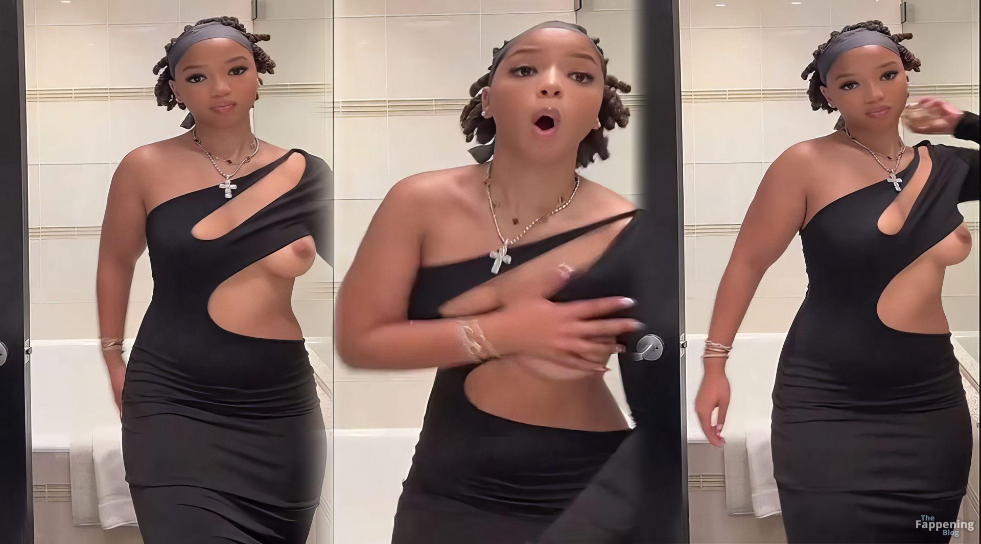 Actress and singer Chloe Bailey just went viral with the new wardrobe fail: boob slip in a bathroom selfie TikTok vid.