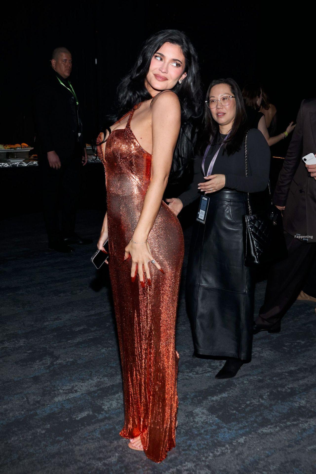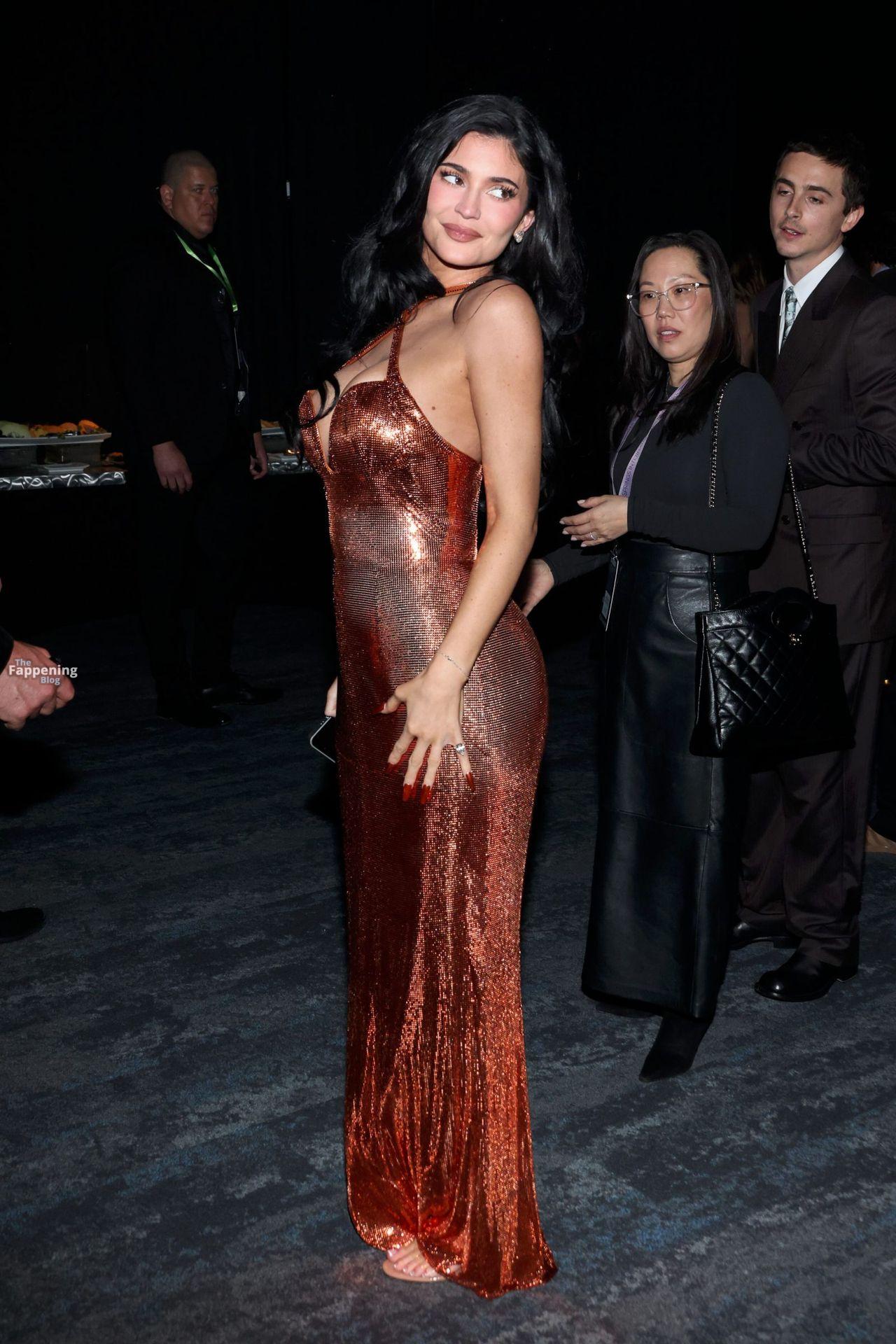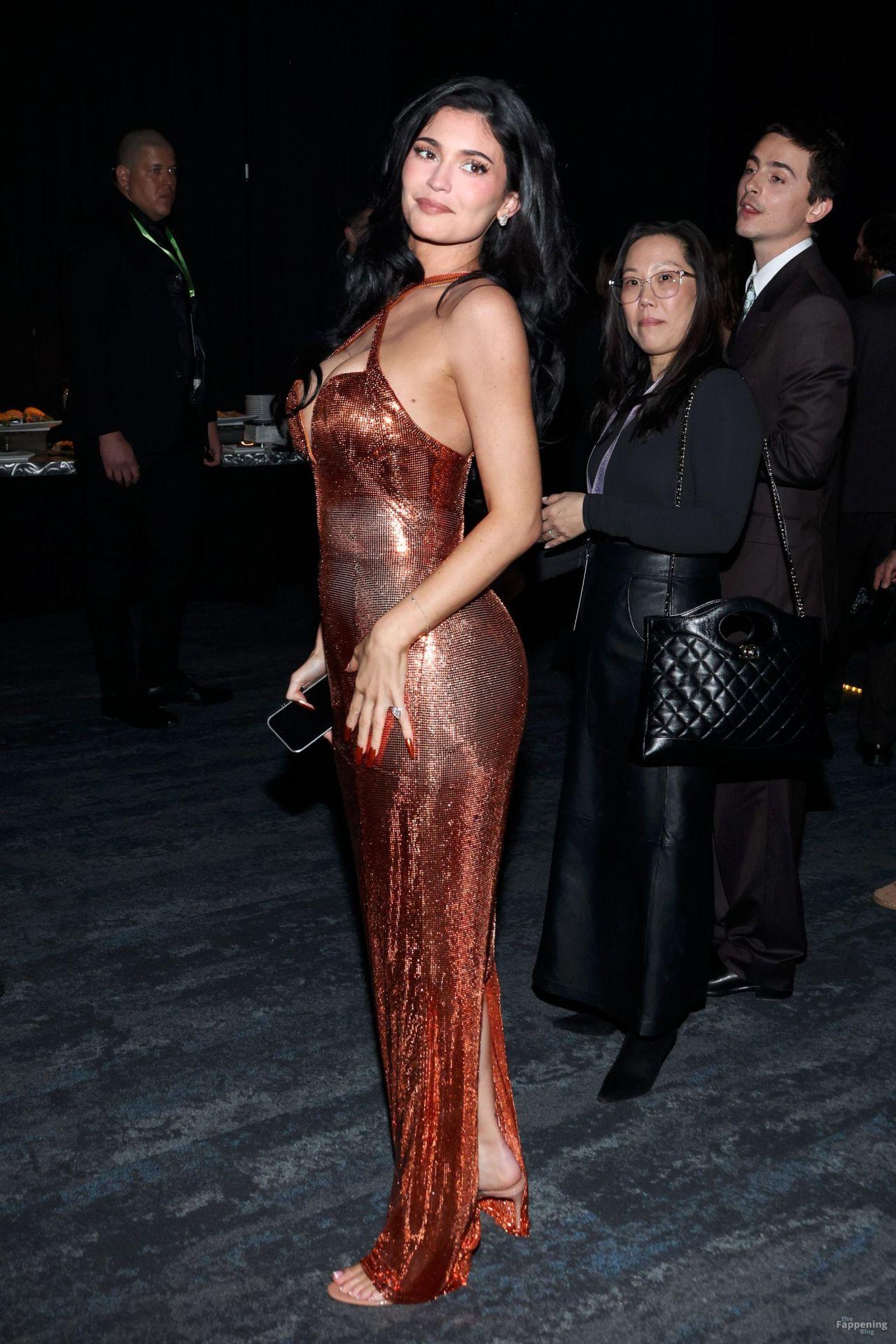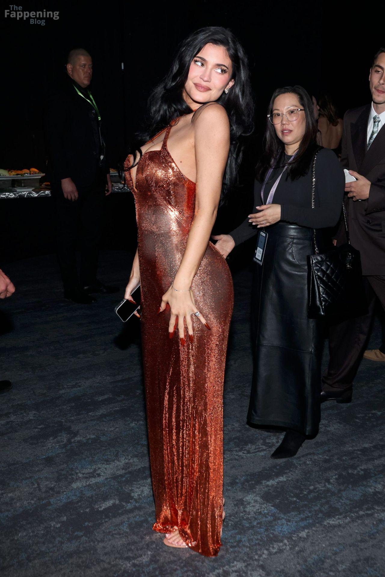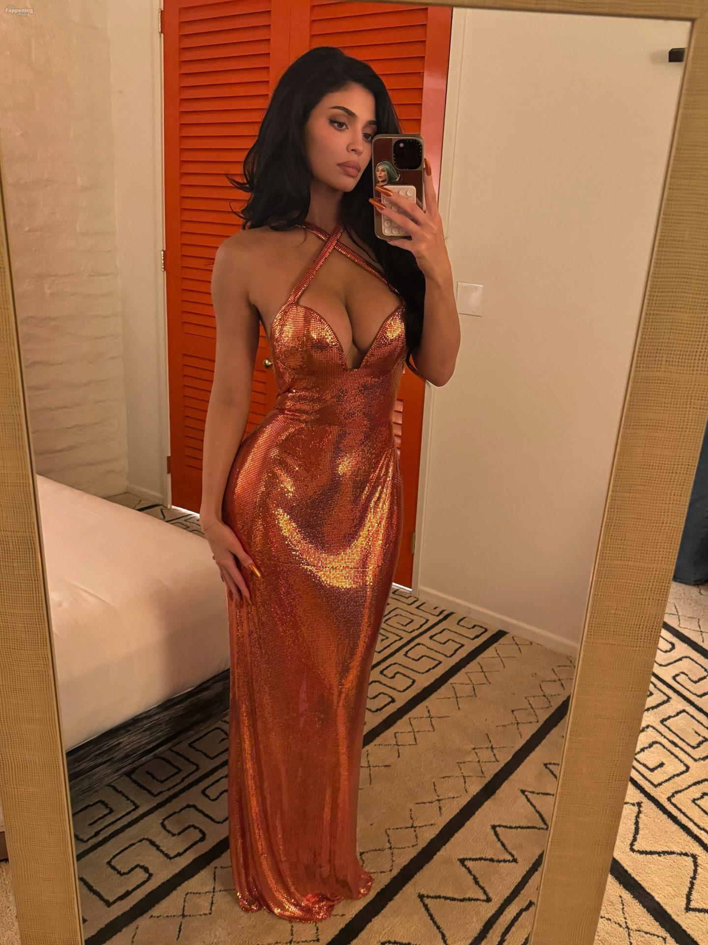 Kylie Jenner shows off her sexy boobs and booty in a skin-tight metallic dress. Check out her social media and event photos.